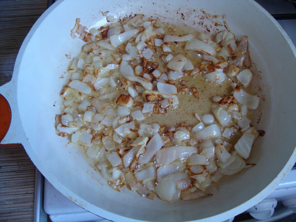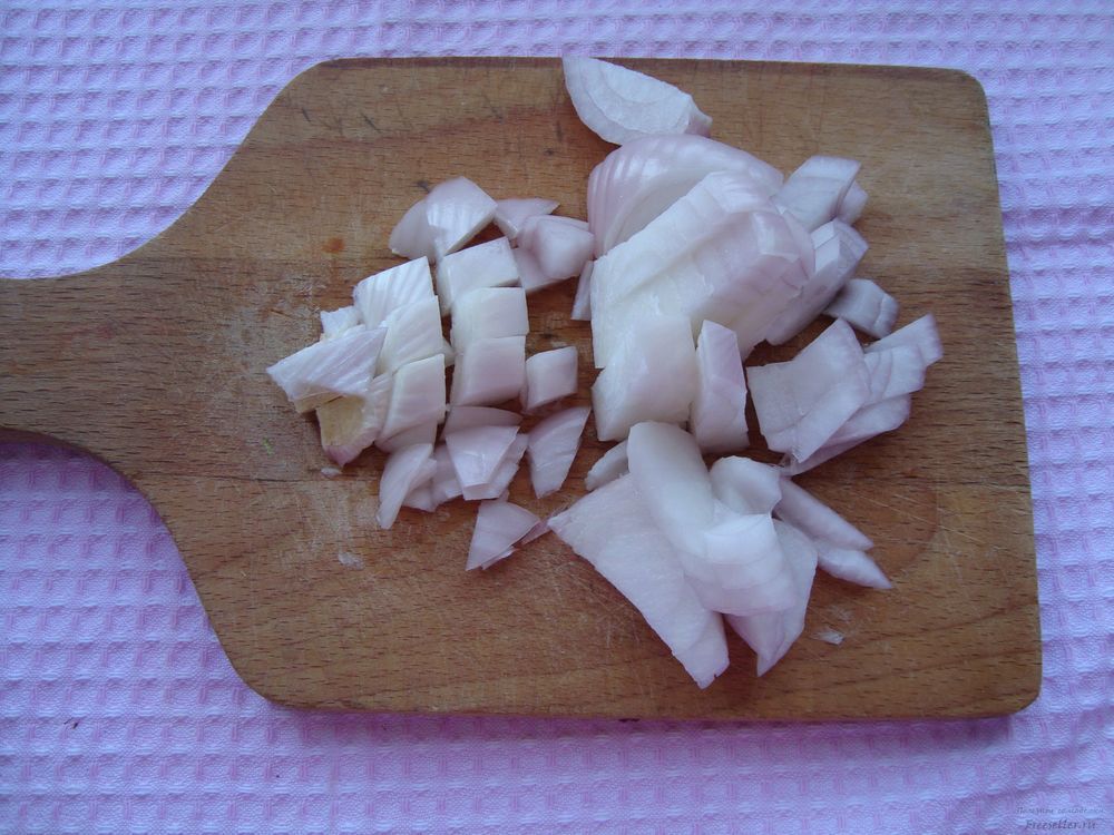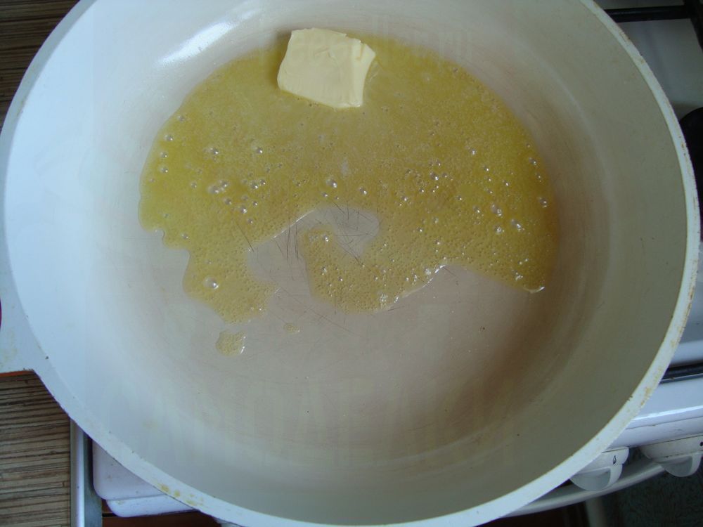 Сначала режется лук для обжарки. Обжаривается он строго на сливочном масле до едва золотистого цвета.