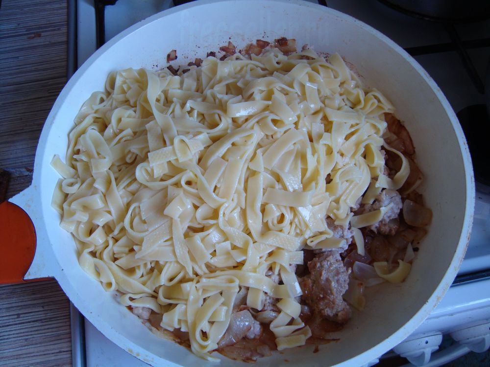 Макароны добавляются в глубокую сковороду к фаршу и луку.