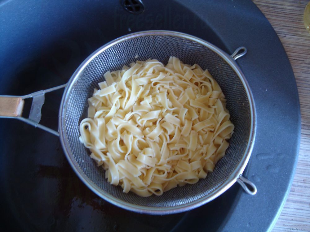 В это время отварите макаронные изделия столько, сколько указано на их упаковке. Затем откиньте их в сито, чтобы сошла вся вода.