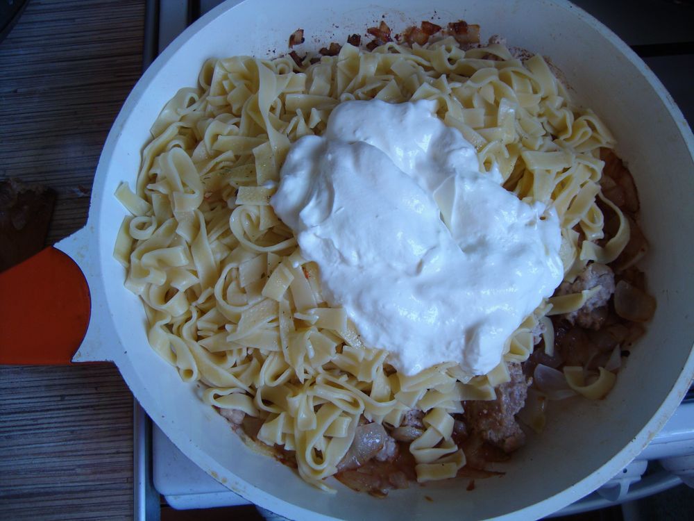 Чтобы наше блюдо не превратилось в традиционные макароны "по-флотски", то необходимо добавить специи, и сметаны (около 3 столовых ложек).