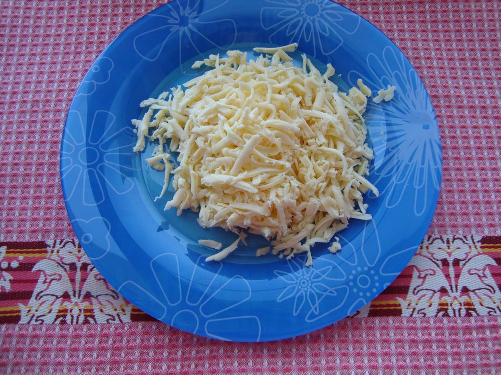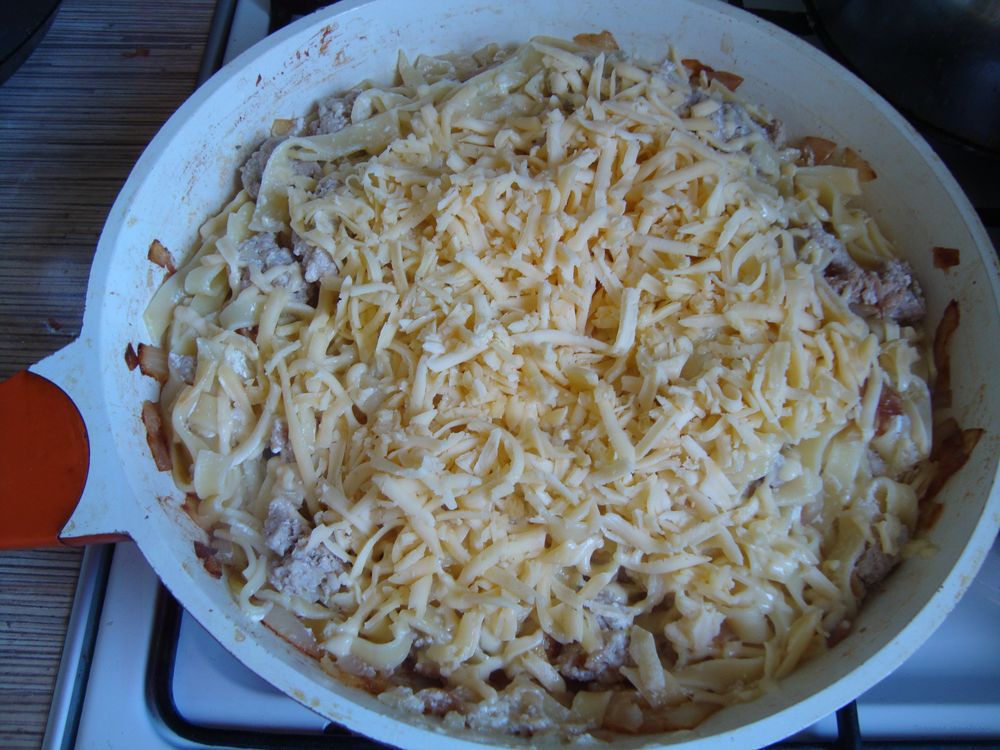 Сыр натирается крупно и засыпается поверх макарон, перемешивать не нужно.