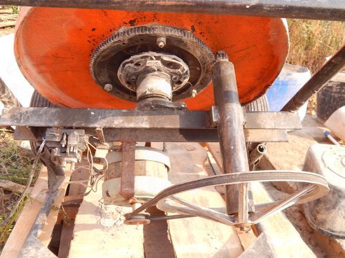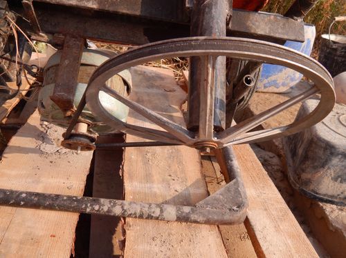 - на двигателе стоит шкив диаметром 6 см, который (ременной передачей) вращает большой шкив (от стиральной машины автомат) на 34 см, он одной осью соединен с шестерней стартера от Москвича, он и вращает маховик, на котором груша.