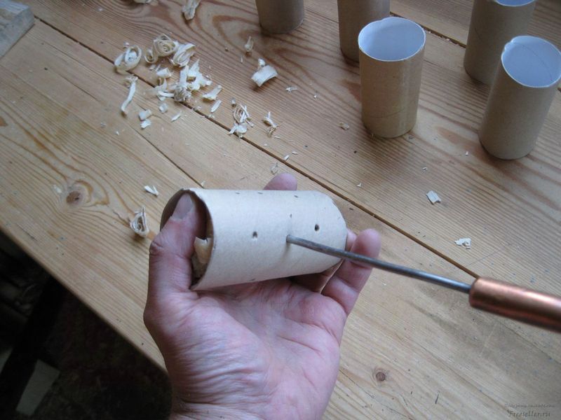 Далее протыкаем втулки набитые стружками шилом с разных сторон в нескольких местах. Причем чем больше будет таких дырок, тем лучше наши втулки будут гореть.