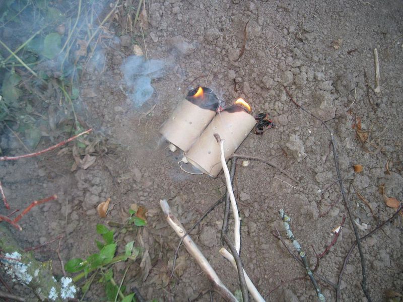Держим втулку в руке еще несколько секунд, чтобы она получше разгорелась, а затем кладем ее на землю, на место будущего костра.