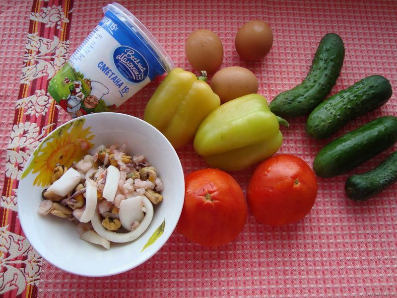 Для салата потребуются свежие овощи: помидоры, огурцы и перец. Еще заготовьте морской коктейль, его потребуется окалo 300 гр. Заправляют салат сметаной или майонезным соусом. Насыщенность вкусу добавляют вареные яйца, их заготовьте в количестве 1-2 штук.