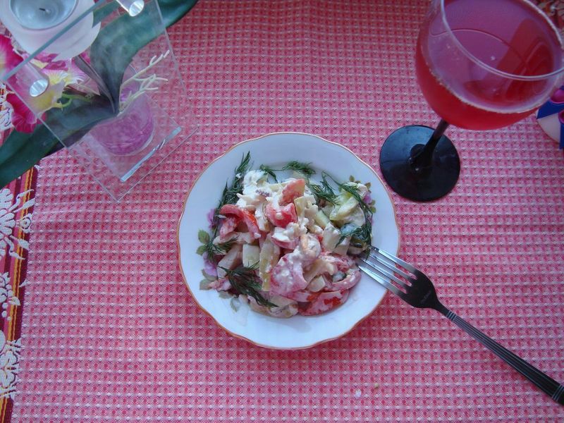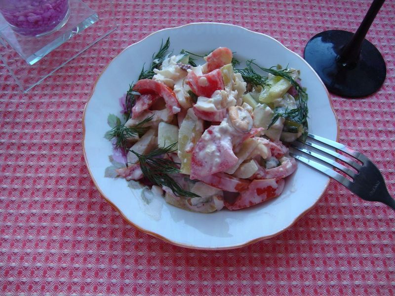 Сочетание сочных овощей и специфического вкуса морепродуктов дарят салату интересные оттенки. Такое блюдо может украсить праздничный стол или послужить отличным завтраком при ежедневной трапезе.