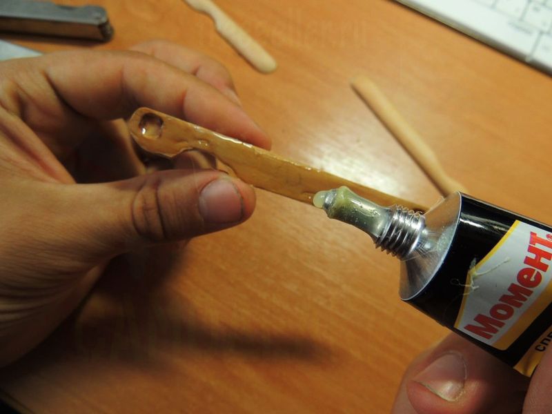 Так как нужно было чем-то соединить все эти части с рукояткой, был взят обычный клей для обуви, другого попросту не было, и так: берем и намазываем и прикладываем, вытирая при необходимости остатки клея.
