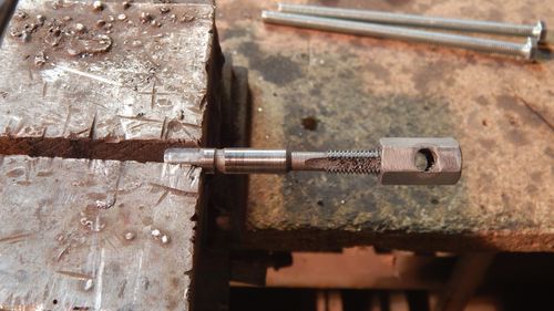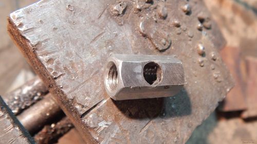 После сверления в средине гайки резьба будет иметь заусенцы и что бы их убрать нужно гайку прогнать метчиком М8.