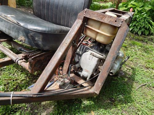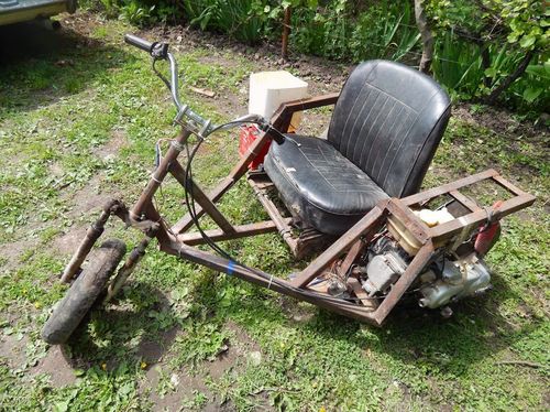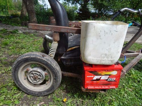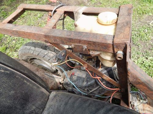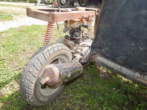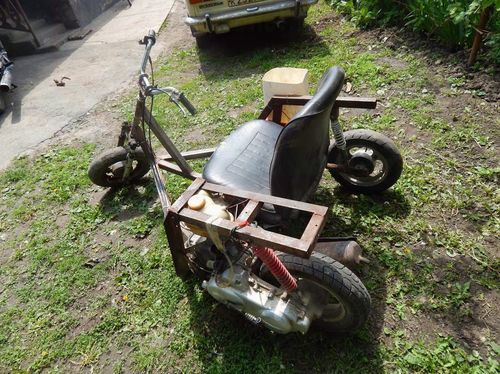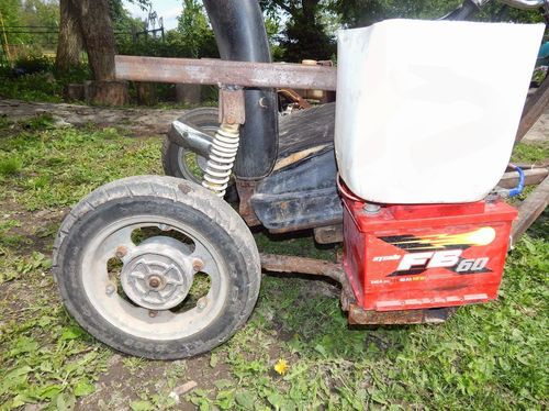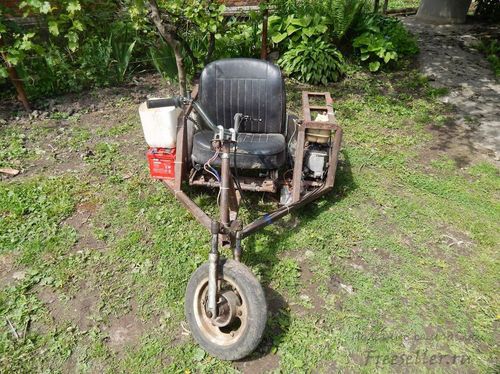 Так же имелась передняя вилка от скутера. Рама была сварена из профильных труб и уголков. В задней части трайка с одной стороны полностью двигатель с колесом и амортизатором, а с другой просто маятник с колесом и амортизатором, и привод соответственно только на одно колесо. Кресло от Запорожца. Тормоз только на приводное колесо. Топливный бак из бачка омывателя стекол. Проект не был доделан до конца и покрашен потому, что после того как немного покатались, появилась идея сделать спереди тоже два колеса, но это пока только планы. А сейчас катаемся на нем, так как есть.