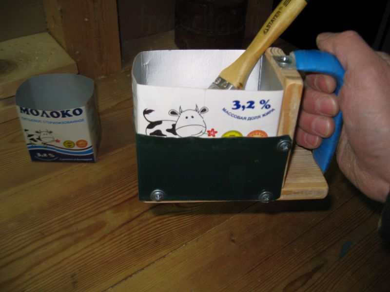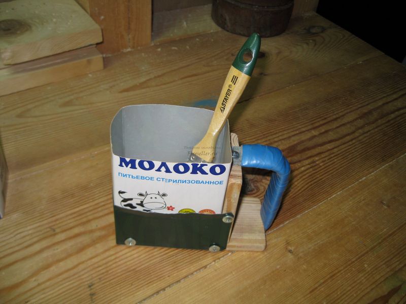 Держатель для одноразовых емкостей под краску, лак, морилку и другие защитные покрытия. В качестве одноразовых емкостей, используются картонные пакеты из-под молока или сока.