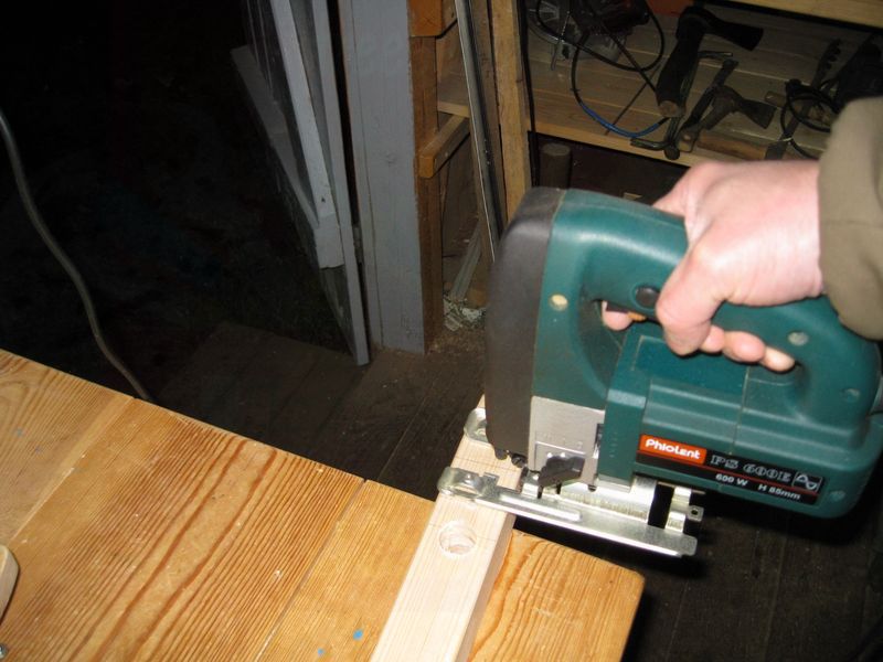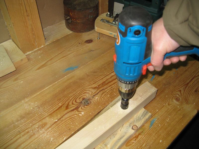 Затем с одной стороны бруска, на некотором расстоянии от просверленного ранее отверстия, я выпилил кольцевой пилой отверстие диаметром 19 мм.