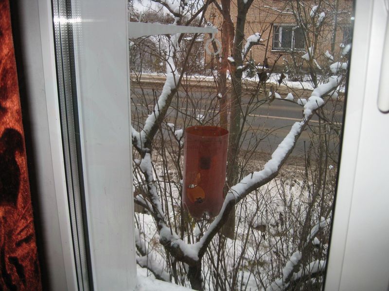 Обычно на зиму, мы всегда вешаем кормушку за окно перед форточкой, чтобы удобно было насыпать в нее мелкий корм. При этом сама кормушка вешается на специальное крепление.