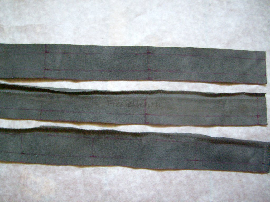 3. Отступив сверху 2 см, складываем ремень с первой полоской лицевыми сторонами вовнутрь и сшиваем по длинному срезу близко к краю. Размечаем середину по всей длине ремня и линию сгиба полоски.