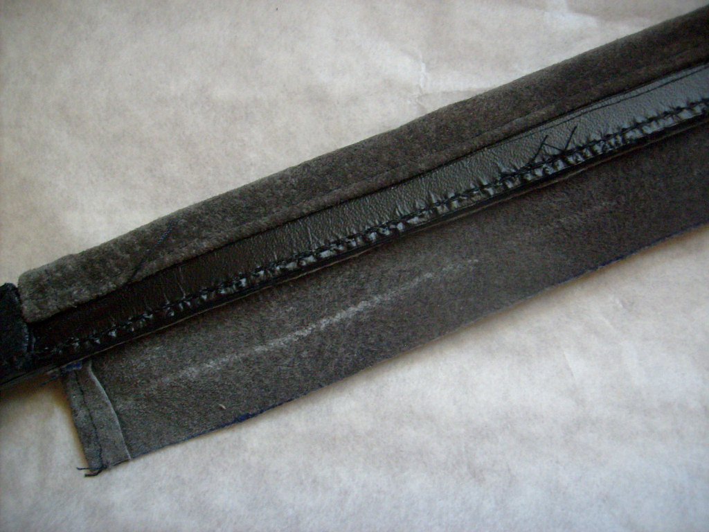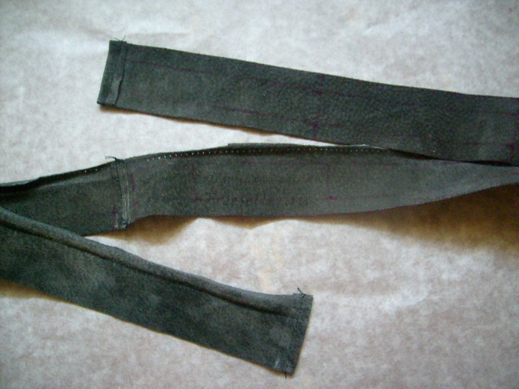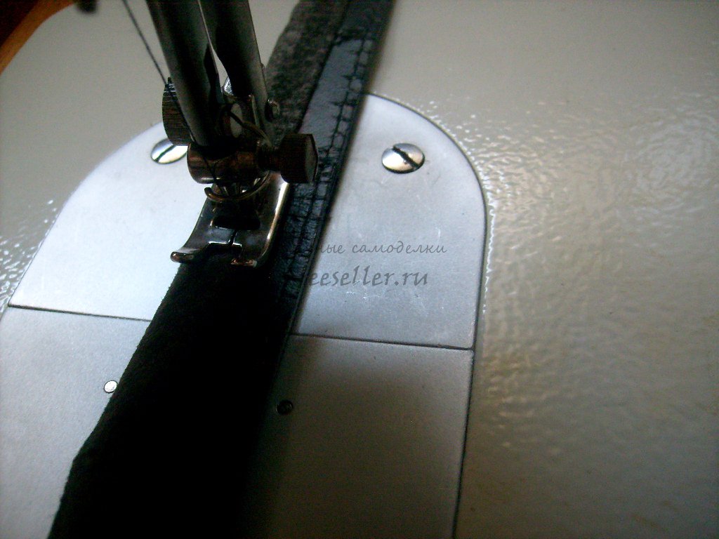 4. Подвернув второй длинный срез полоски вовнутрь, совместив линию сгиба с серединой ремня, пришиваем полоску с изнанки. Половина ремня обработана.