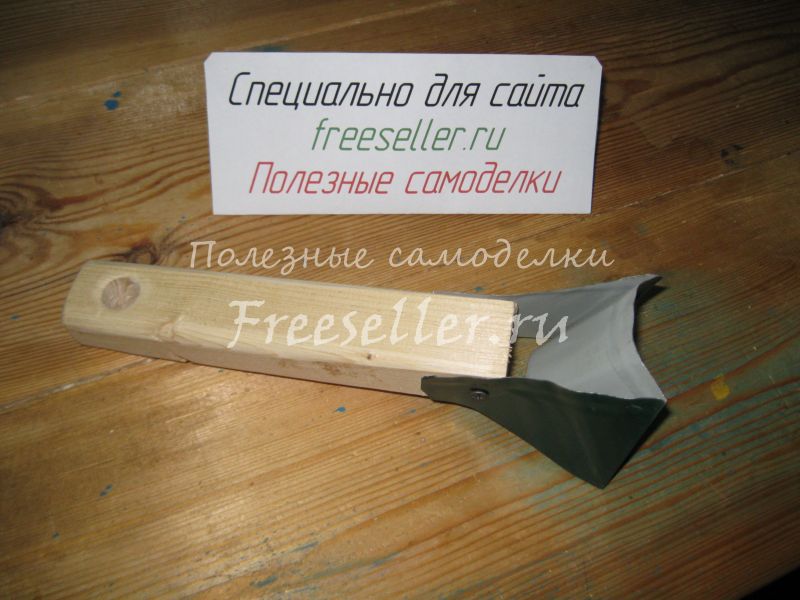 Отрезаем ножницами по металлу лишние части и подгоняем заготовку рабочей части нашего скребка к деревянному бруску, который будет служить рукояткой.