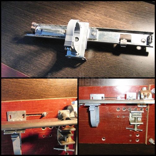 В текстолите были высверлены отверстия и нарезана резьба под футорки для крепления струбцины, зажима под ножи, стойки. В струбцине имеются два крепёжных и два направляющих винта с потайной головкой. Такая конструкция позволяет перемещать тисочки в разных направлениях.