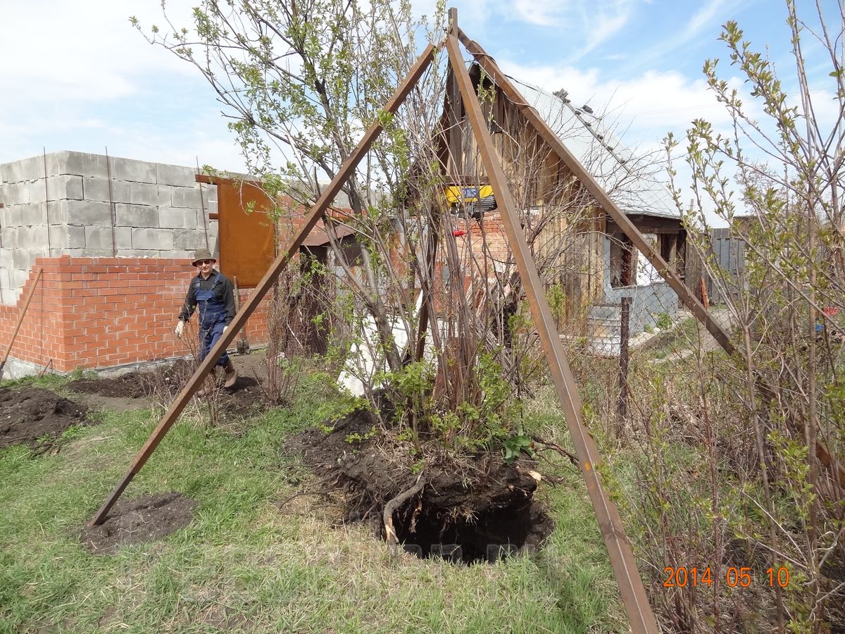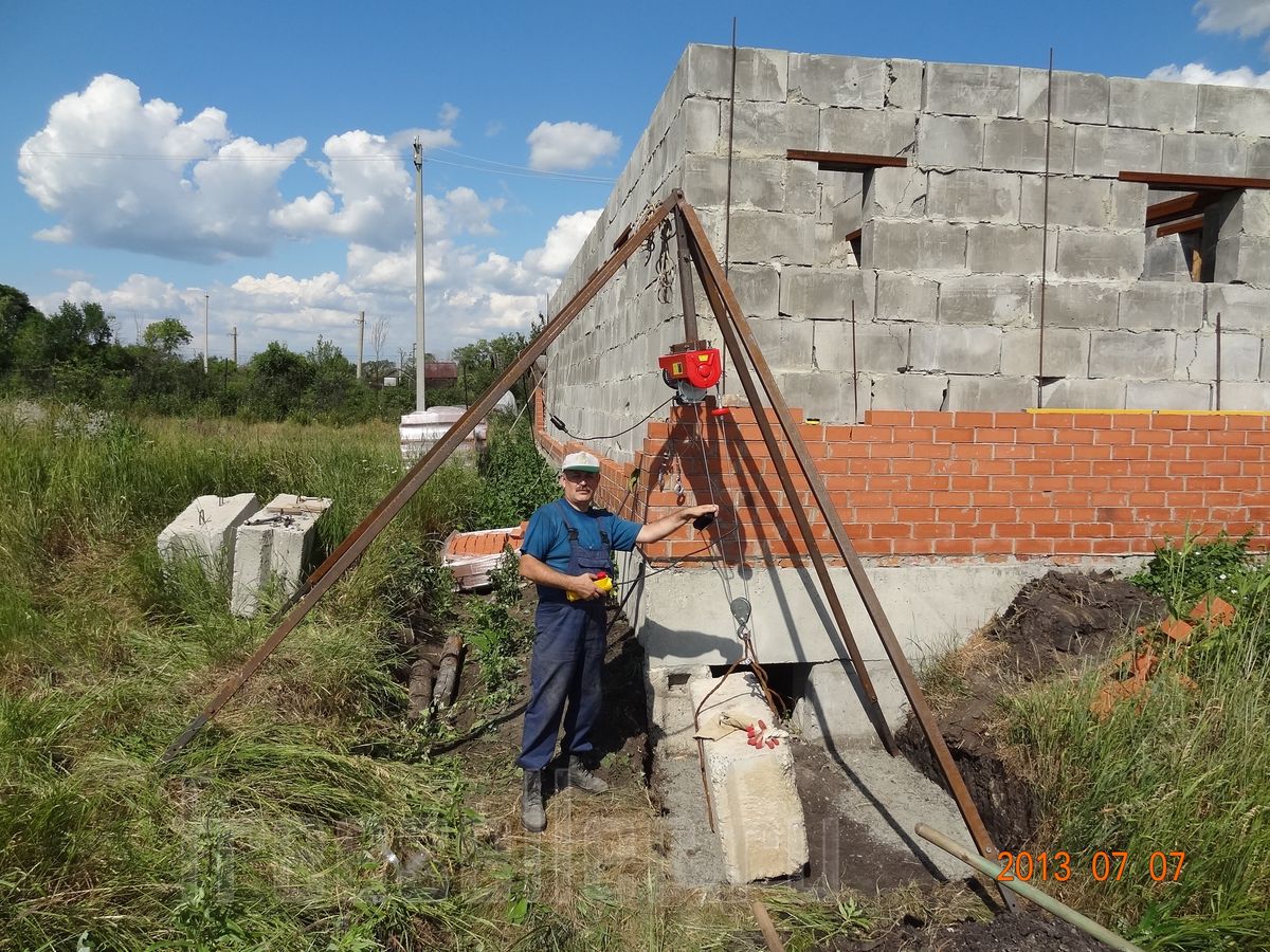 При строительстве садового дома, в частности монтажа фундамента, возникла необходимость укладки фундаментных блоков небольшого размера (800*400*600 и 1200*400*600). Большинство блоков установили с помощью крана, но до дальнего угла будущего дома, как ни старались, кран не дотянулся, блока в количестве 9 шт. проста перебросили по возможности ближе к нужному месту. И вот зародилась мысль создать кран-треногу. Конечно мысль стара как мир и всё же.... Только вот от трёхопорной системы я сразу отказался. Четырехопорная система оказалась удобнее, особенно при перемещении в собранном состоянии (двигаемся как шагающий кран, более устойчивой. Для начала установили ручную лебедку - это был какой то кошмар - после пары подъёмов язык на плечо. Альтернативы электро лебёдке не было. Транспортировка крана простая - всё в багажнике кроме ног опор, длина их 3 м. на багажнике на крыше легкового авто. Сборка максимум 30-40 минут.
