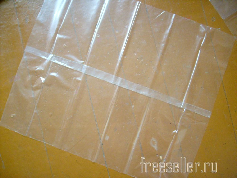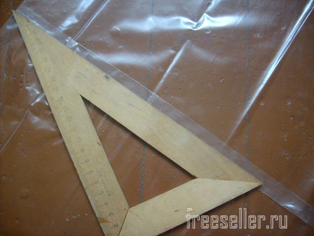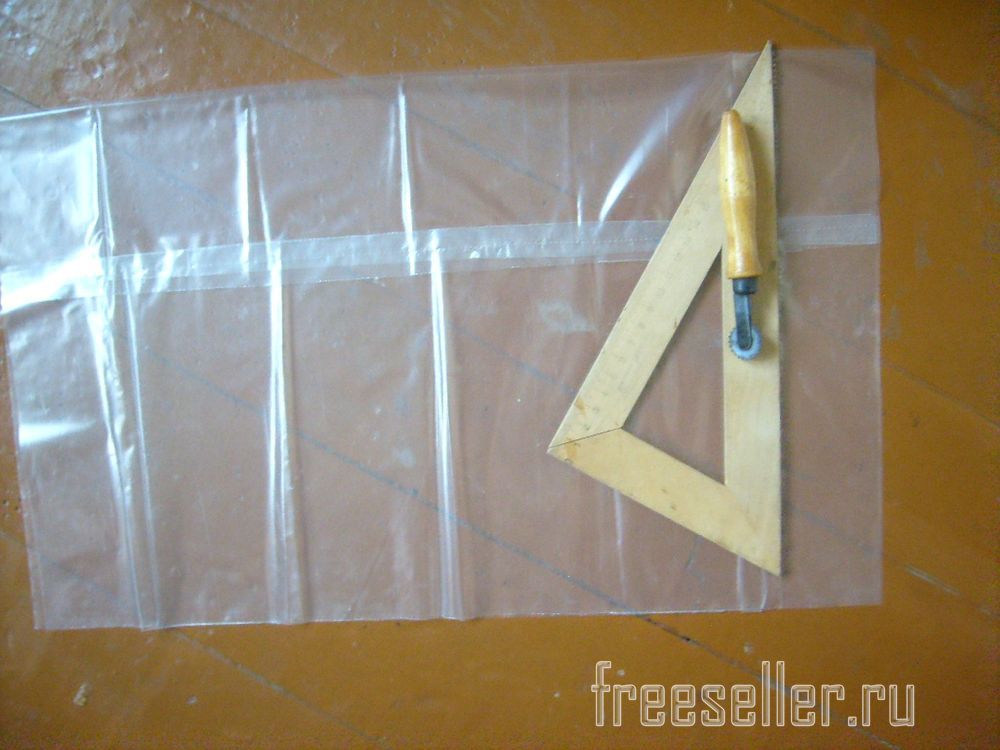 4. Складываем полученный фрагмент целлофана пополам. Совмещаем края. Прижимаем линейкой нижний край. По линейке прочерчиваем линию раскалённым маркером.