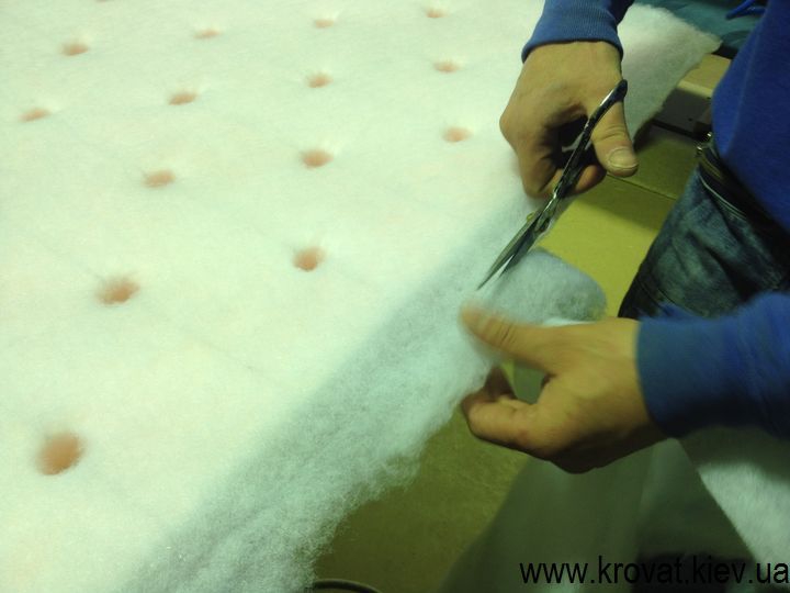 Обклеиваем синтепоном для скольжения материала и выравнивания неровностей и складок. Можно обойтись и без него.