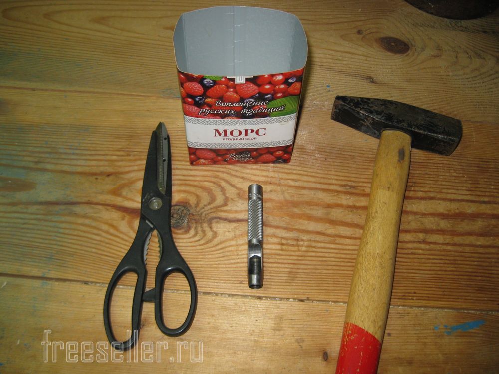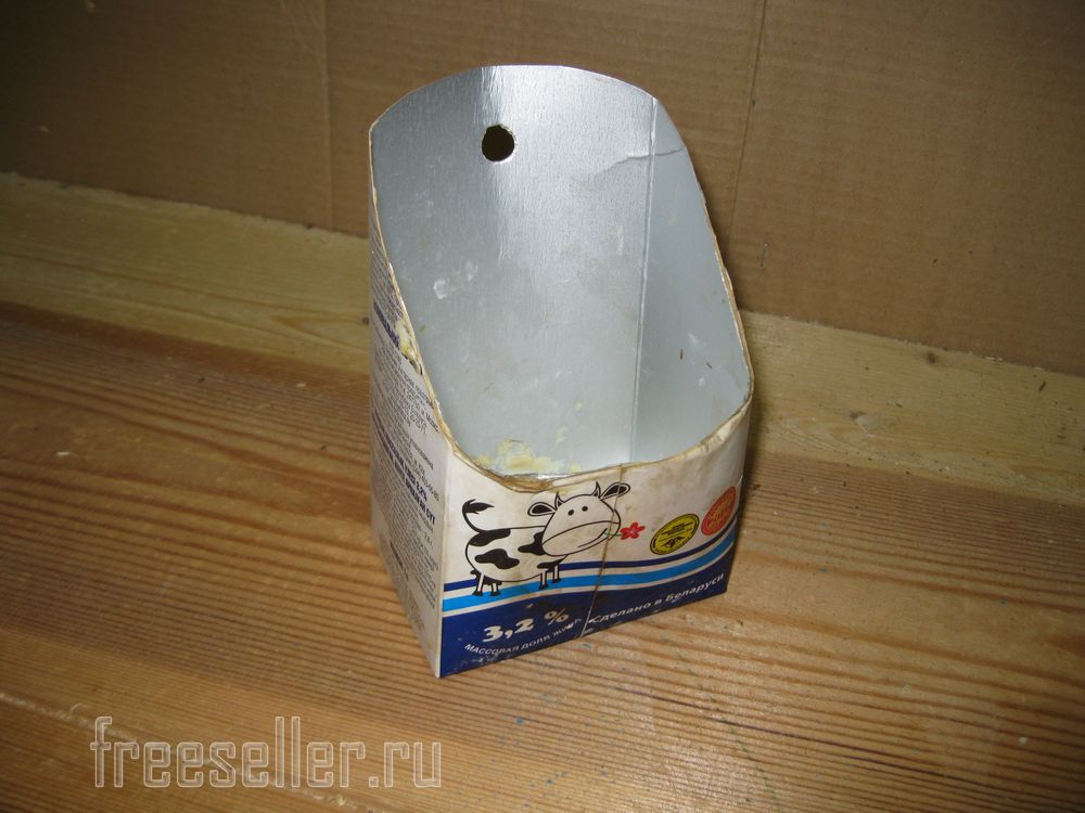 Для этого нам понадобится картонный пакет из-под молока или сока с отрезанным верхом, желательно заранее чисто вымытый и просушенный, а также ножницы, мелкая наждачная бумага и пробойник с молотком (необязательно).
