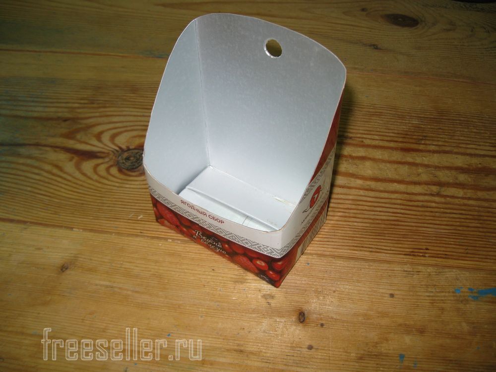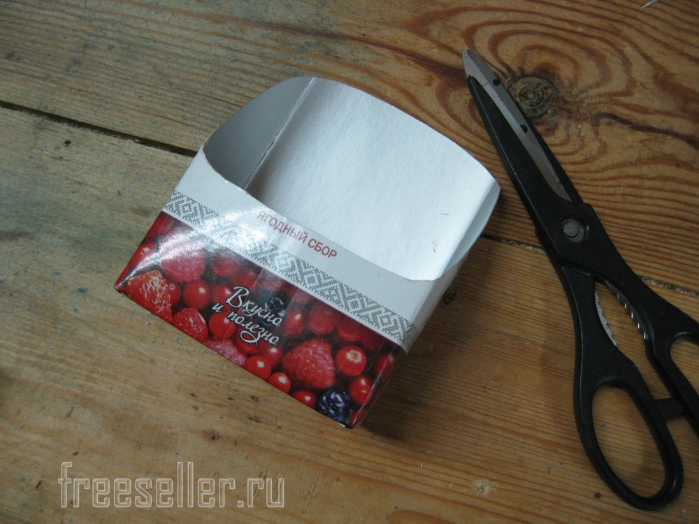 Для начала мы обрезаем ножницами картонный пакет вот таким образом, делая длинную заднюю стенку и короткую переднюю. Высоту передней стенки нужно делать в зависимости от размеров куска мыла, которое мы будем класть в эту мыльницу.