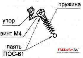 Разумеется, надежность работы устройства будет во многом зависеть от конструкции датчика F1. Перепробовав различные конструкции датчика наклона головы, я выбрал самый простой - его легко можно сделать без применения станков. Он состоит из пружины от шариковой авторучки, латунного винта М4х5 и контактного упора (рис. 3). Винт вставляется в пружину и припаивается (с помощью флюса или таблетки аспирина). Второй конец пружины укорачивается и крепится на плате.
