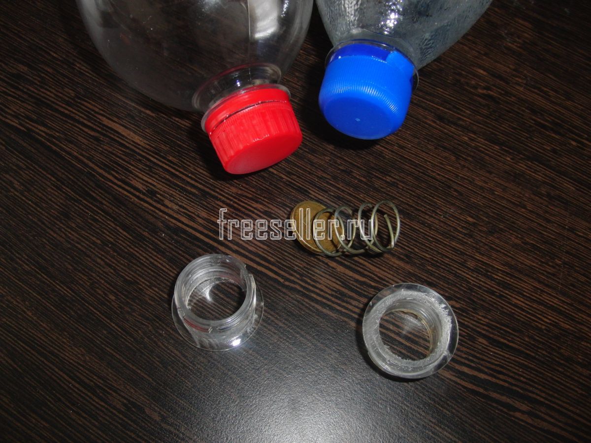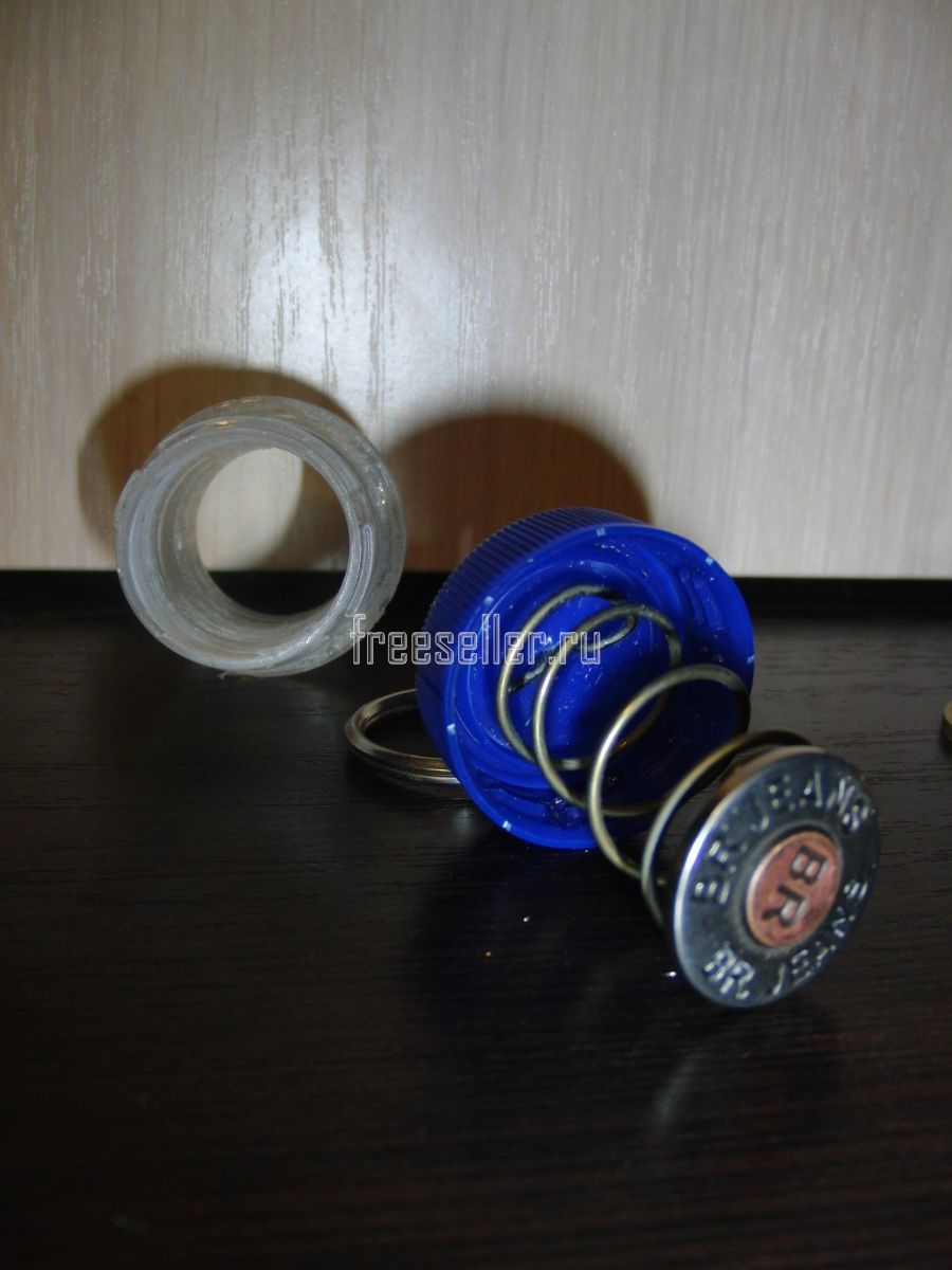 Изготовить монетницу из пластиковых бутылок очень просто. Для начала отпиливаем ножовкой горлышки у бутылок и склеиваем их между собой. Подготавливаем пружинку: делаем изгиб с двух сторон для крепления пуговицы с одной стороны и фиксации пружинки в крышке с другой. В одной из крышек делаем надрез, в который будет вставляться ушко пружинки и фиксироваться цепочкой с колечком. Бормашинкой обрабатываем другую крышку, как на фото.