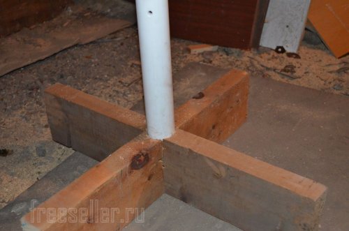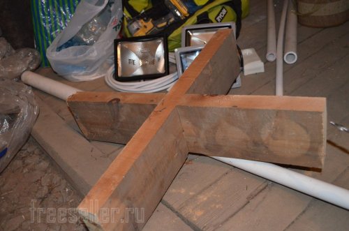 В качестве крестовины я взял доску 40мм на 120мм! Крестовина получилась 60см на 60см. Грамозко зато устойчиво! Поверьте пробывал делать меньше, на длине 2,80м не устойчиво! Прожектора перевешивают!