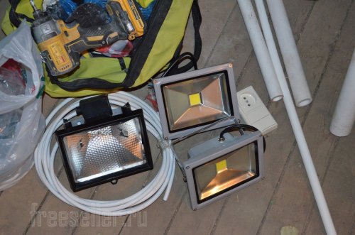 Прикупил 2 прожектора на 20 ватт каждый+провода, выключатель с розеткой и решил по быстрому смастерить так сказать телескопическую стойку с двумя прожекторами!