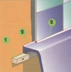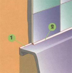 Укрепляют ванну на упоре (1). В качестве упора - используем брусок. а лучше алюминиевое правило., затем обрабатывают герметиком два места соединения, как показано выше (2)