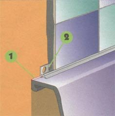 Сначала промазывают герметиком соединение стены и ванны (1). затем кладут герметичное уплотнение и уже на него - плитку.