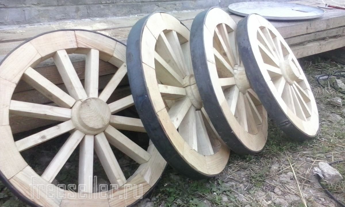 И обруч практически заколачивается в клинья или обруч нагревают и при надевке на колесо охлаждают водой иначе ничего на нем не перевезешь – развалится. Они, колеса конечно же должны быть в диаметре одинаковы все…