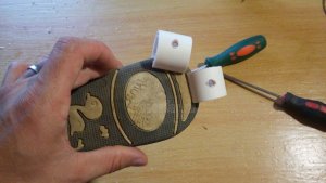 Теперь что бы привести струбцину в боевое (рабочее) состояние, необходимо в готовые отверстия вставить отвертки и приложив небольшое усилие "раздвинуть" ее. Можно вместо отверток поставить шпильки и притянуть их гайками.