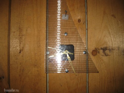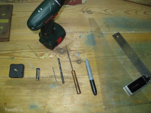 А затем просверлил в центре отверстие диаметром 8 мм, для крепления часового механизма, а по четырем сторонам, отверстия диаметром 3 мм, для закручивания шурупов.