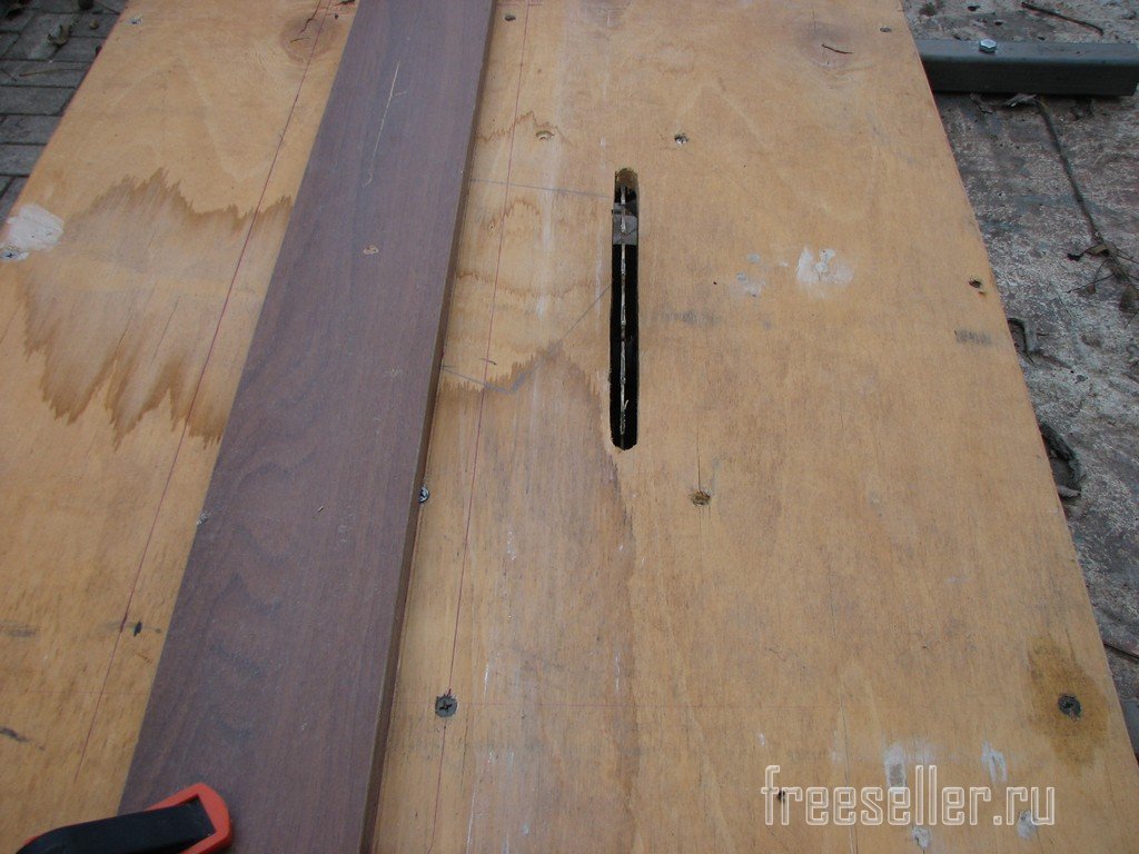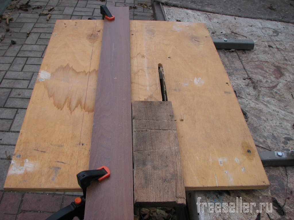 В качестве направляющей у меня был ровный и ламинированный со стороны распила кусок ДСП, который крепится к столику простыми струбцинами. На фото уже конечно не те струбцины что были изначально, со временем покупаю понемногу инструмент ;)