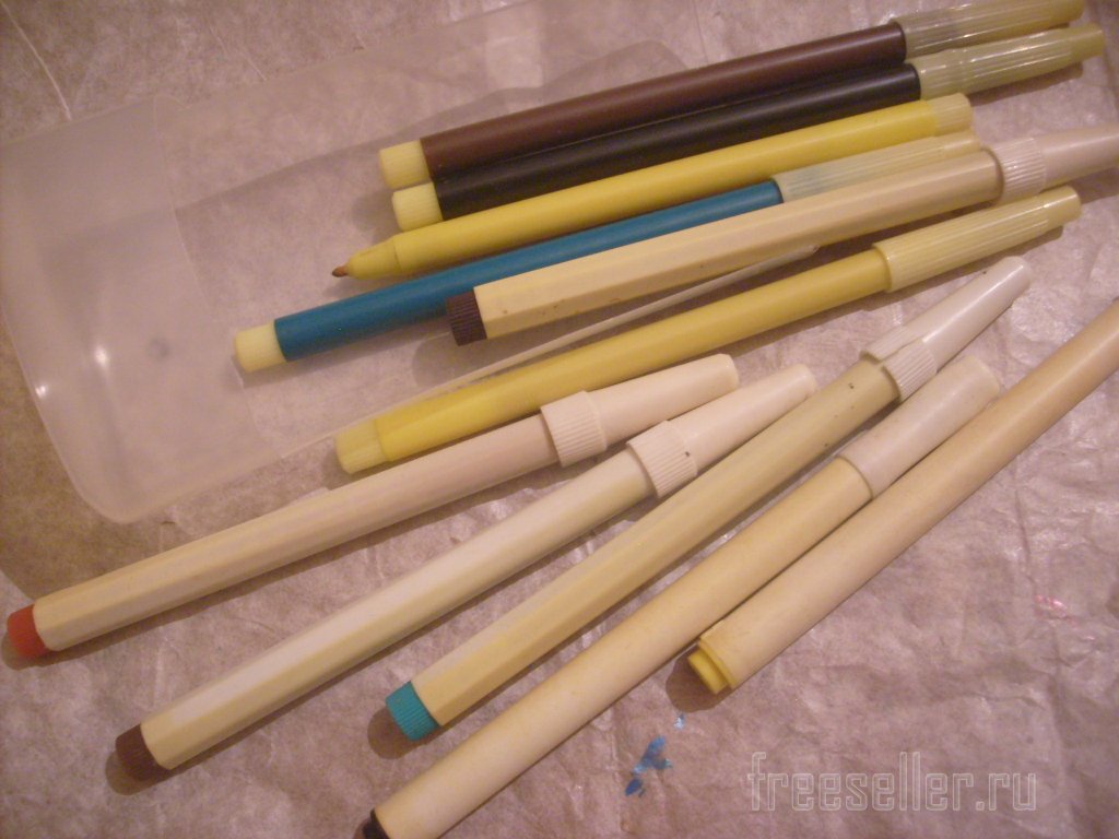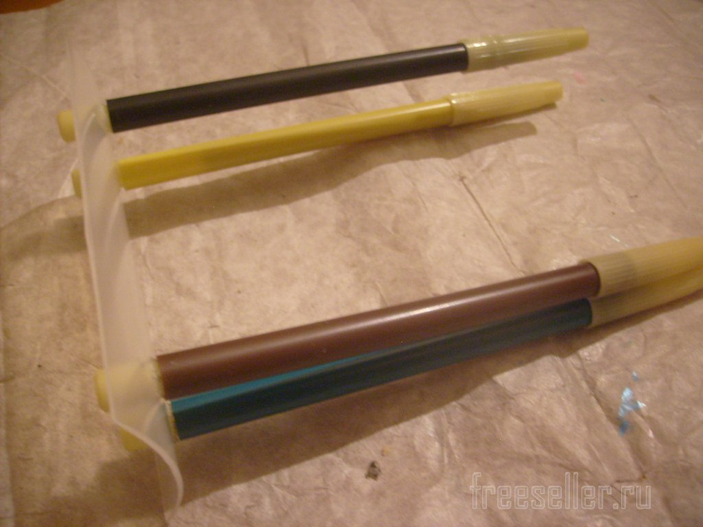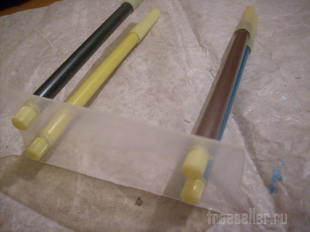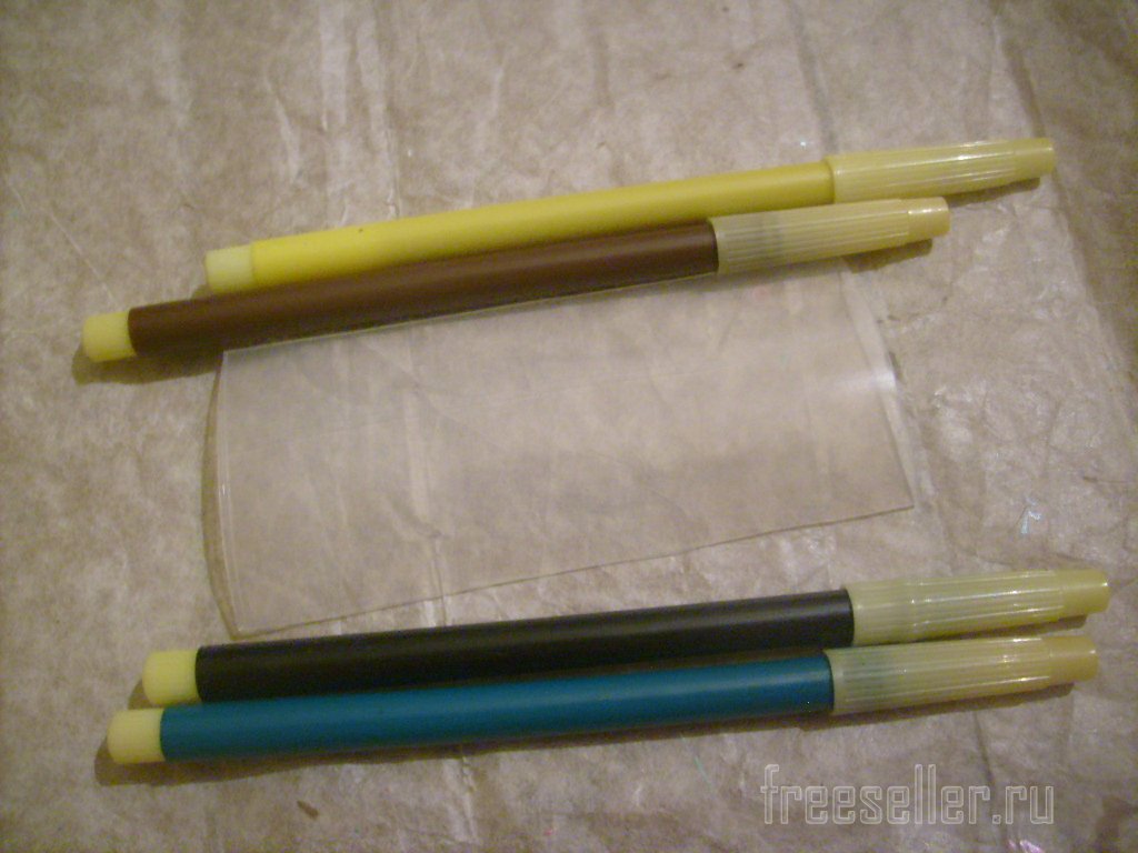 Из фломастеров мы сделаем вертикальные держатели, их нижние втулки послужат ножками нашей конструкции, а пластик - основой.