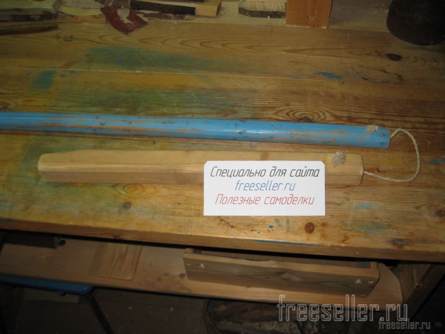 Затем просверлил в нем два отверстия, точно таким же образом, как и в рукоятке и также продел через эти отверстия веревку, соединенную с рукояткой.