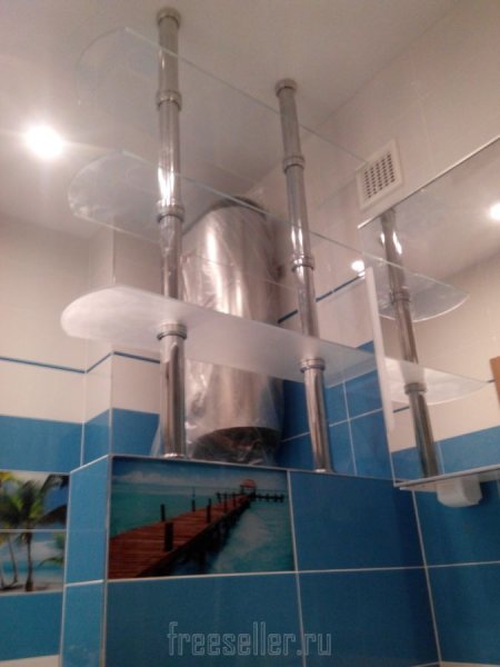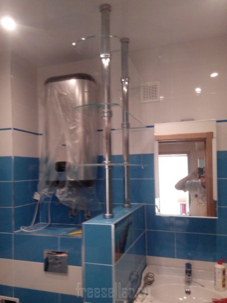 Итак конструктивно перегородка из стеклянных полочек представляет собой 2 нержавеющих трубы, диаметром около 50 мм, трубы фиксируются с помощью специальных опорных площадок снизу к конструкции из кирпича облицованных керамической плиткой. сверху к натяжному потолку, с предварительно установленной закладной деталью из фанеры.