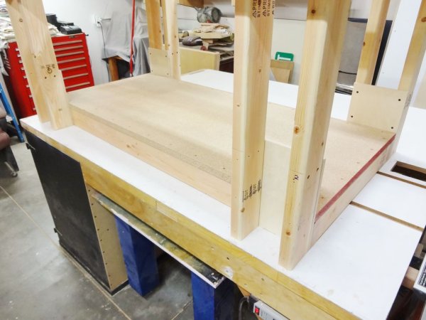 Собираем нижнюю полку из брусков и фиксируем площадкой из ДСП, Устанавливаем с 4 сторон по 2 ноги из досок 50 х 100 мм, закрепляем их к основание через площадку из фанеры.