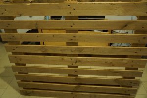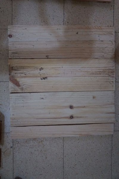 Размеры ящика 43 х 41 х 26 см, соответственно им выпиливаем доски из поддона: 4 доски длиной 41 см и 4 доски по 43 см.