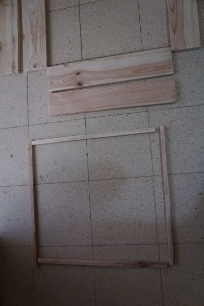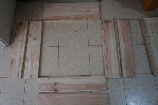 Для изготовления крышки вырезаем еще 5 штук длиной 43 см и 4 детали для тонкой рамки, к которой будут прибиты доски.