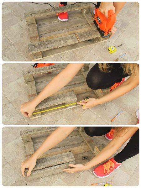 Так же отпиливаем доску, чтобы закрыть лежанку спереди.