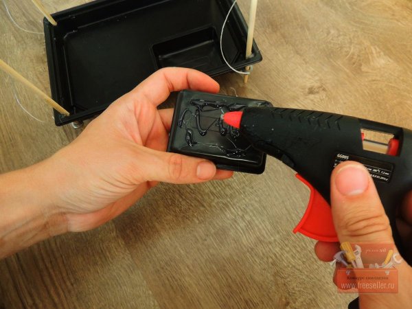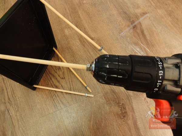 Далее в проделанные отверстия вставляем четыре палочки для суши.