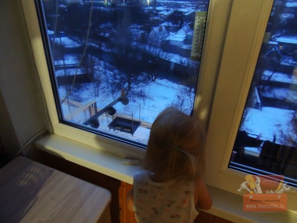 Теперь осталось сделать главное, повесить кормушку на нужное место, в данном случает - это за балконом на бельевой веревке, так как такое место позволяло моей любознательной доченьке любоваться птичками, прилетевшими покушать.