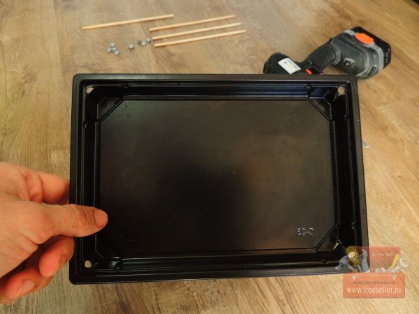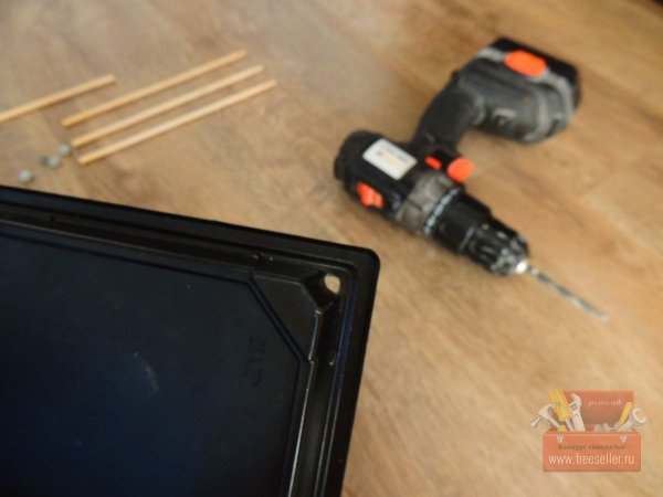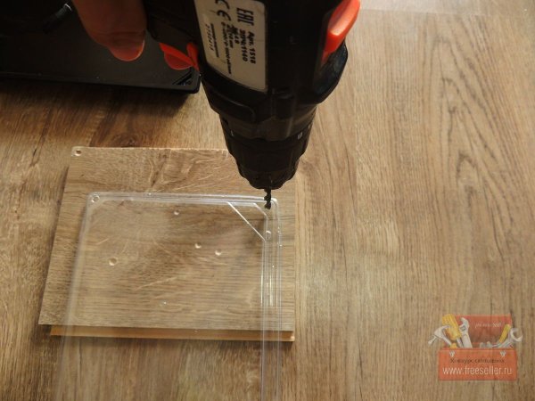 Теперь берем две части, и по углам конструкций сверлим отверстия при помощи дрели, так как показано дна фото.
