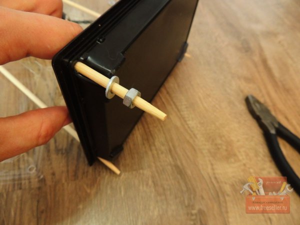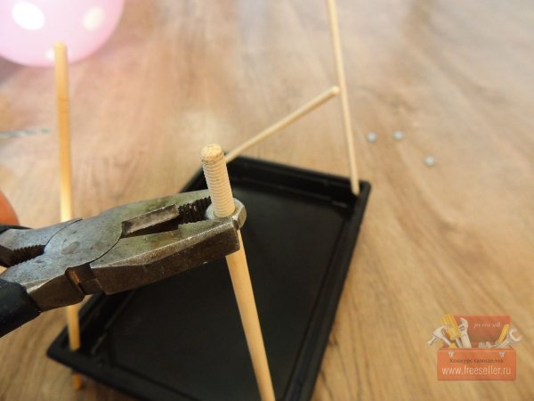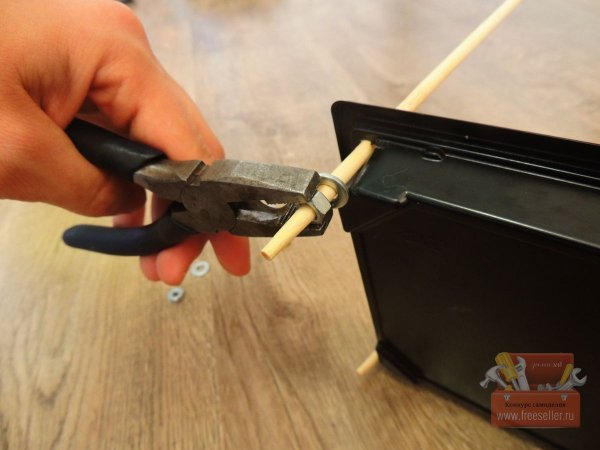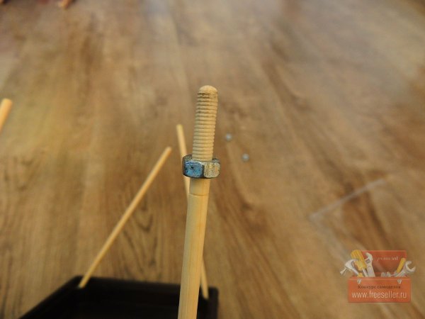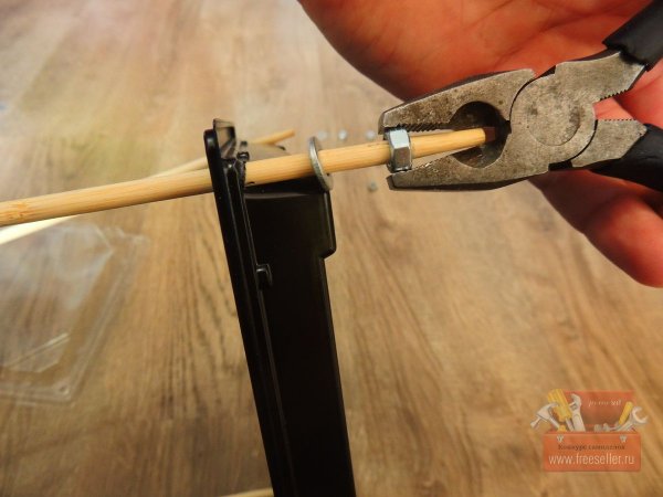 Так как гайка немного меньше диаметра палочки, что нам собственно и нужно для более крепкой фиксации, ее необходимо с усилием закрутить используя для этого плоскогубцы.