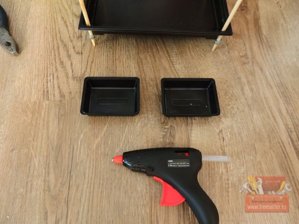 Теперь устанавливаем маленькие лотки для еды, они были так же взяты из суши набора, фиксируем термоклеем.