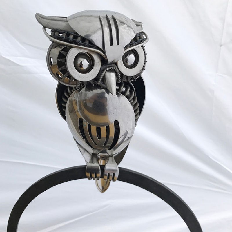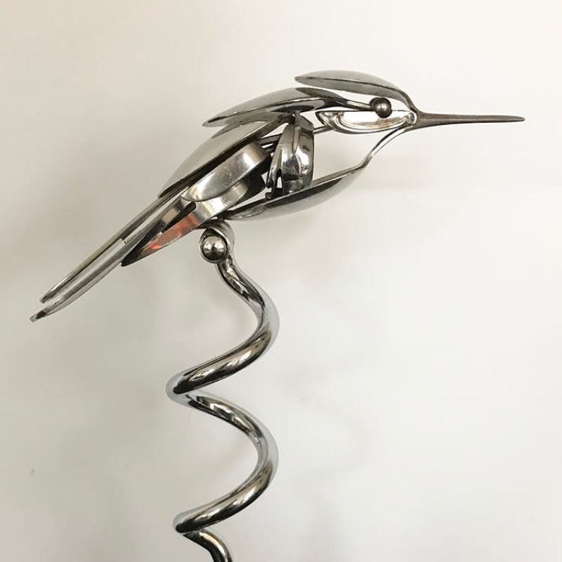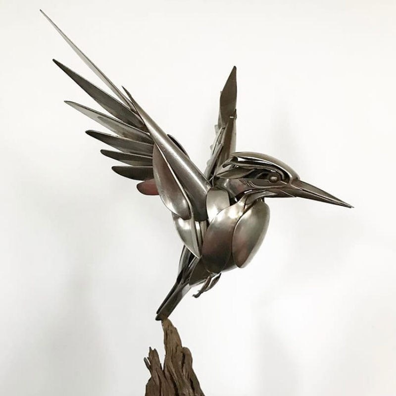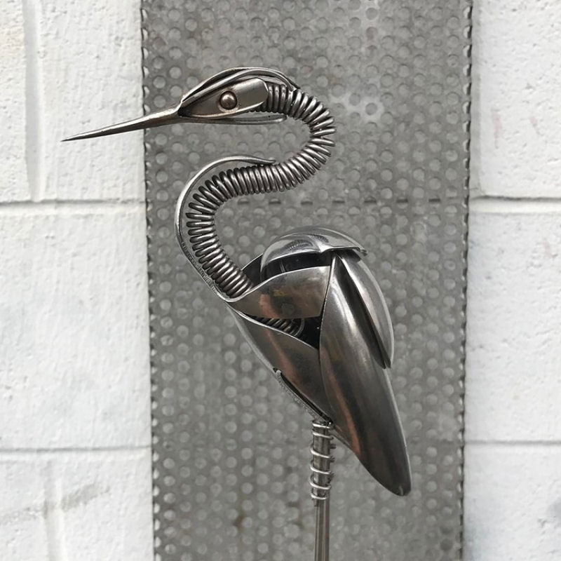 Хотя найденные материалы были повторно использованы и обработаны, они все еще узнаваемы. Длинная катушка металла становится изящной шеей металлической цапли, а в других древние серебряные вилки заменяют птичьи крылья и ноги, а скиммер служит грудой сарая. Мэтт меняет свои творческие интерпретации от дизайна к дизайну.![]()