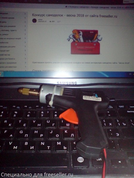 За основу был взят корпус от сгоревшего клеевого пистолета, насос омывателя, микропереключатель, 6-контактный переключатель и цанговый патрон.