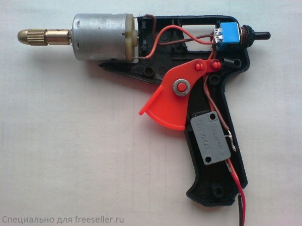 Из корпуса пистолета были вырезаны некоторые части под мотор и переключатель, все детали примерялись по месту.